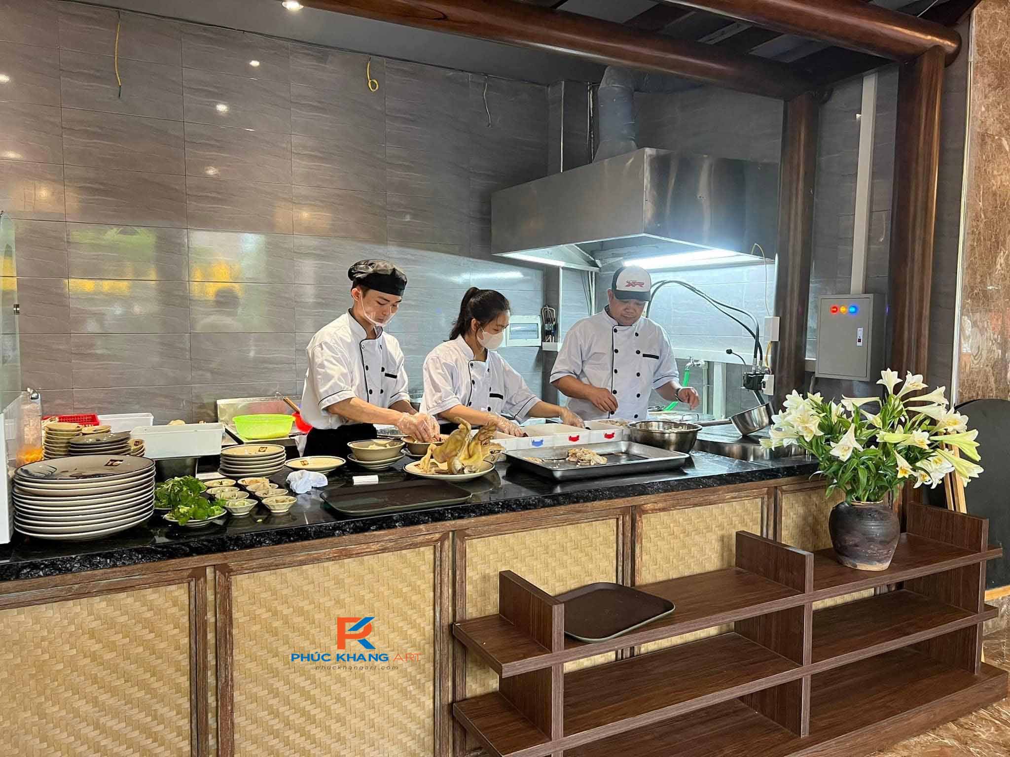 Trang trí vách nhà hàng bằng Cói tre nhân tạo khiến không gian sạch sẽ, thoáng mát